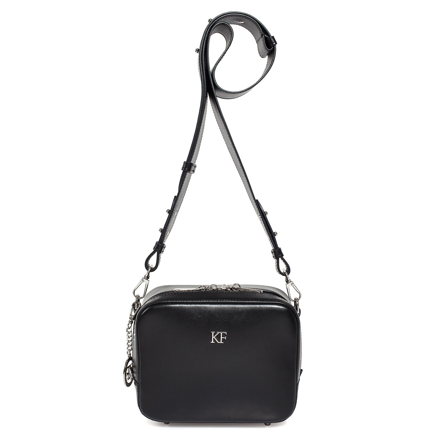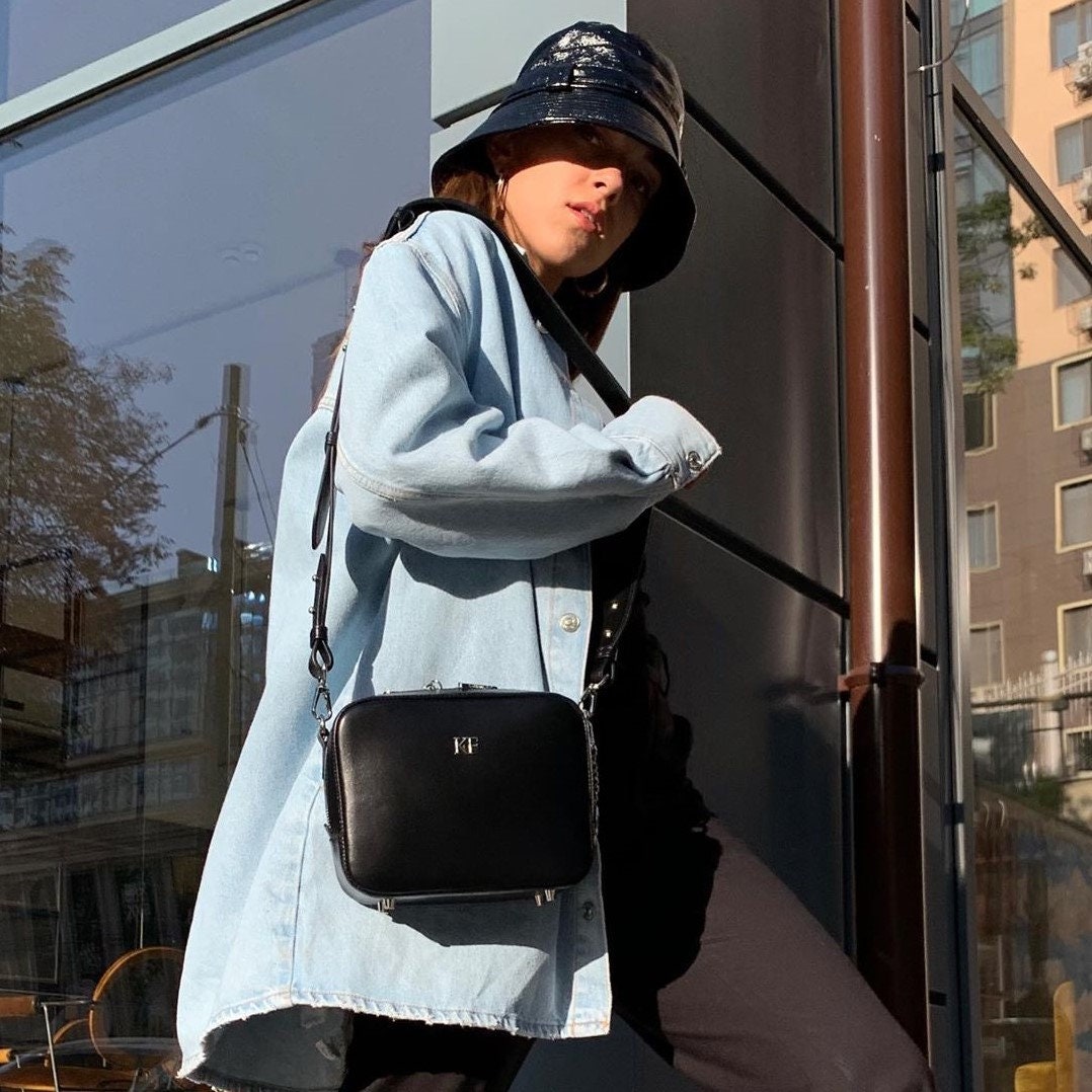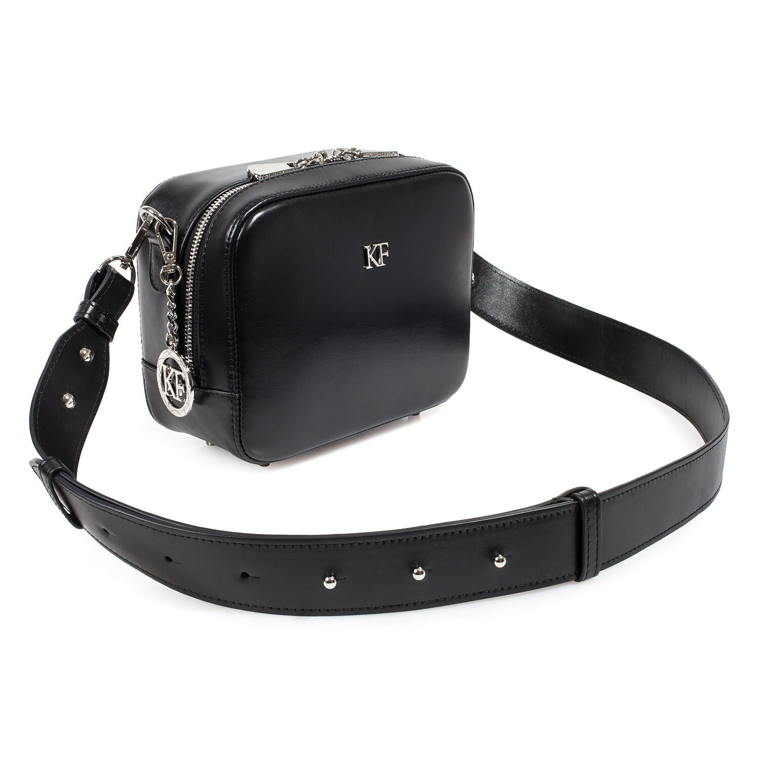 Black genuine leather woman shoulder bag from ukrainian designer Katerina Fox. Fashionable and elegant modern bag KF for bright girls and women. This bag is able to attract attention and highlight your exquisite taste. The internal space of a bag is equipped with one spacious compartment and one zipper pocket. The bag is closed with a zipper. The length of the strap is adjustable. The kit also includes a storage bag.