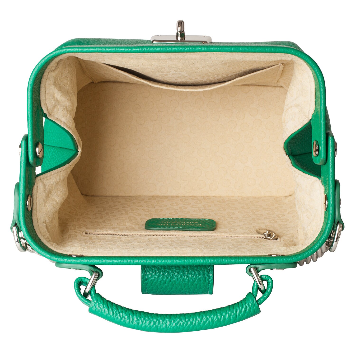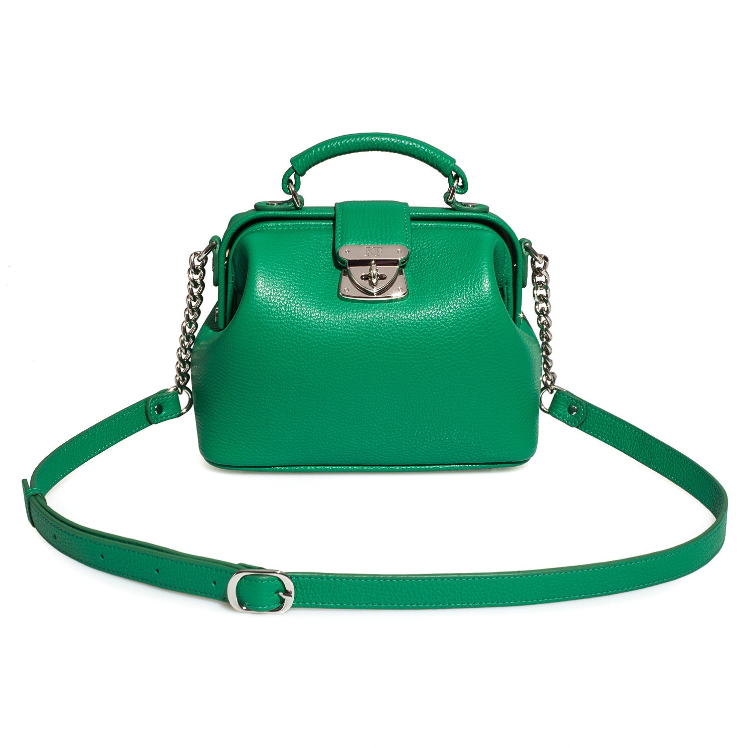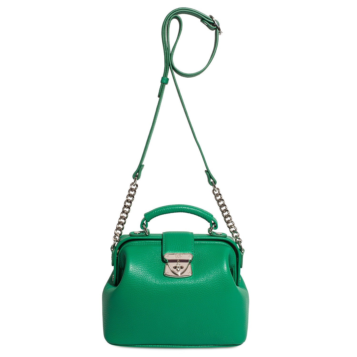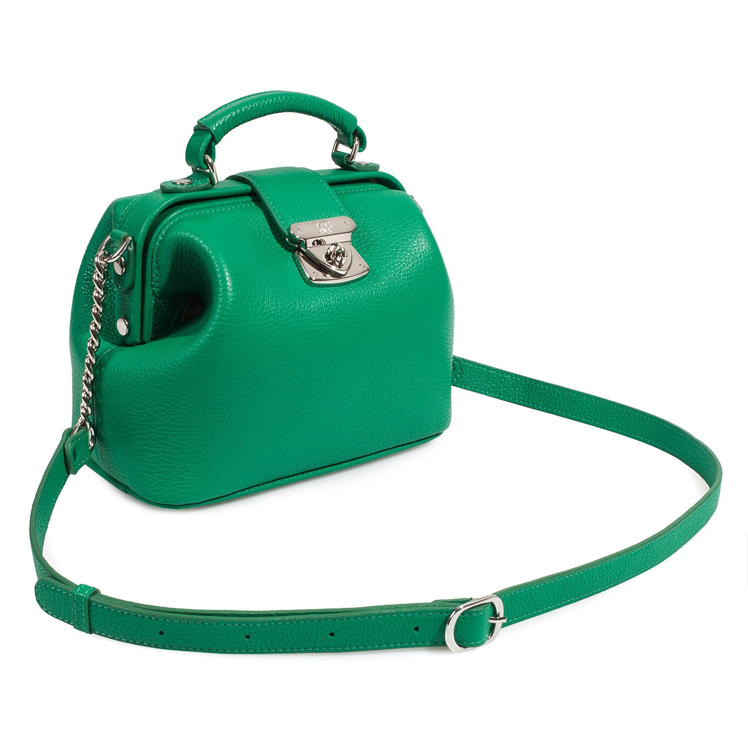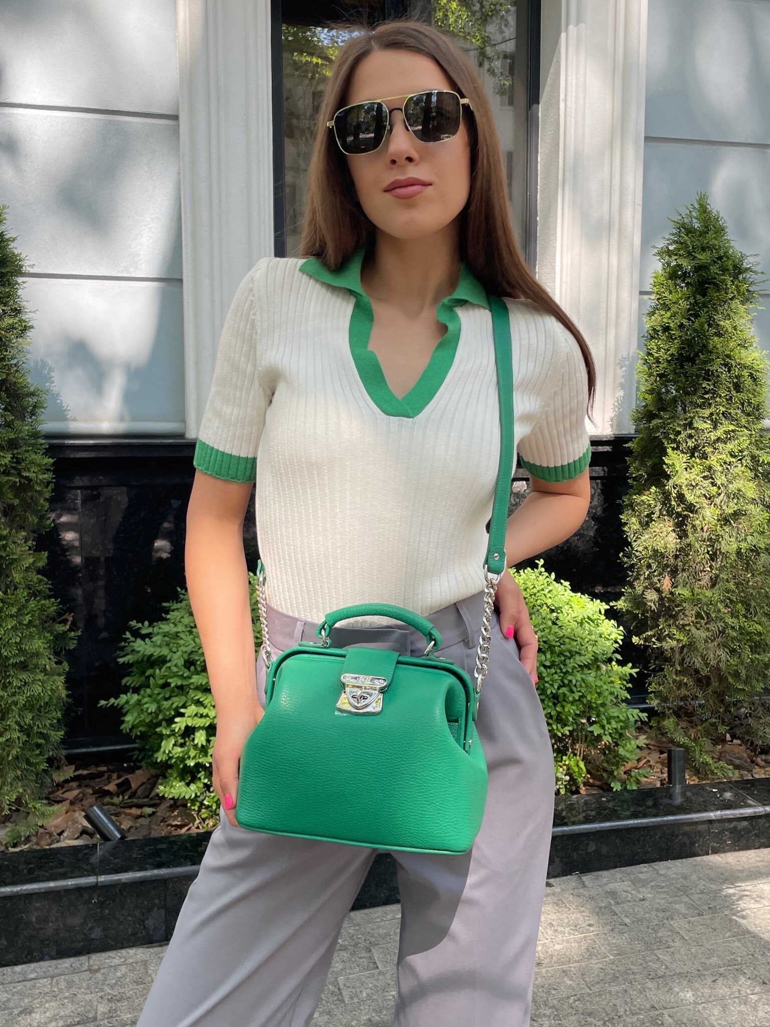 Green genuine leather handbag from ukrainian designer Katerina Fox. This model is designed for women who appreciate the sleek design combined with functionality and comfort. High-quality and reliable hardware ensure long service bags. The internal space of a bag is equipped with one spacious compartment and one patch-pocket and one zipper pocket. The bag is closed with a clasp. The bottom of the bag is protected with metal legs. There is a long handle that allows you to wear the bag on the shoulder. The kit also includes a storage bag.