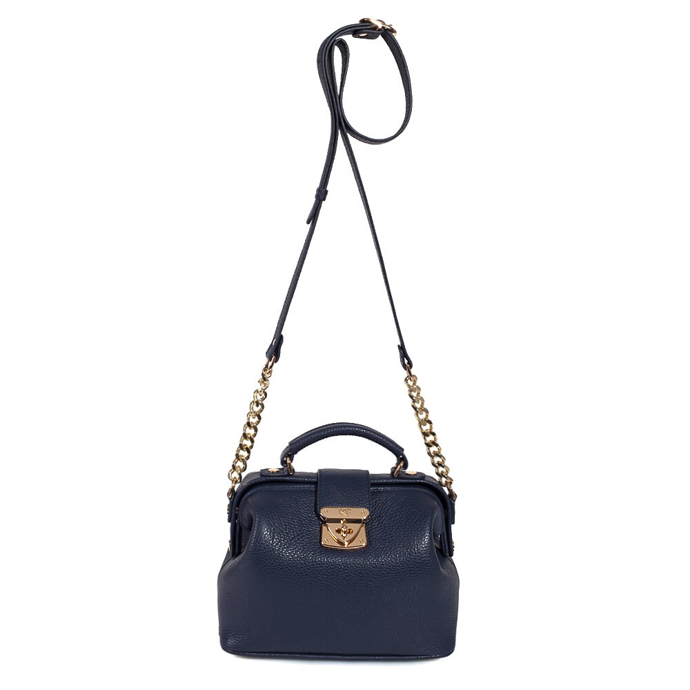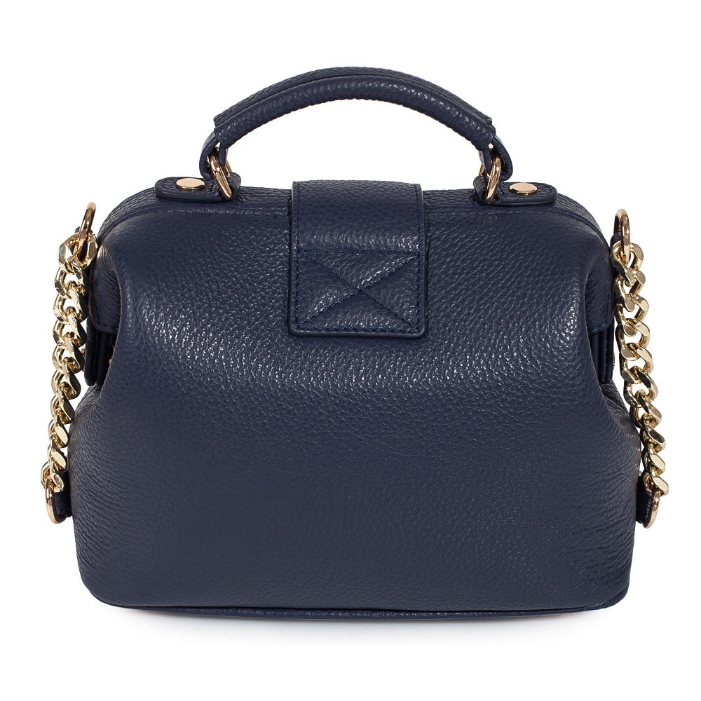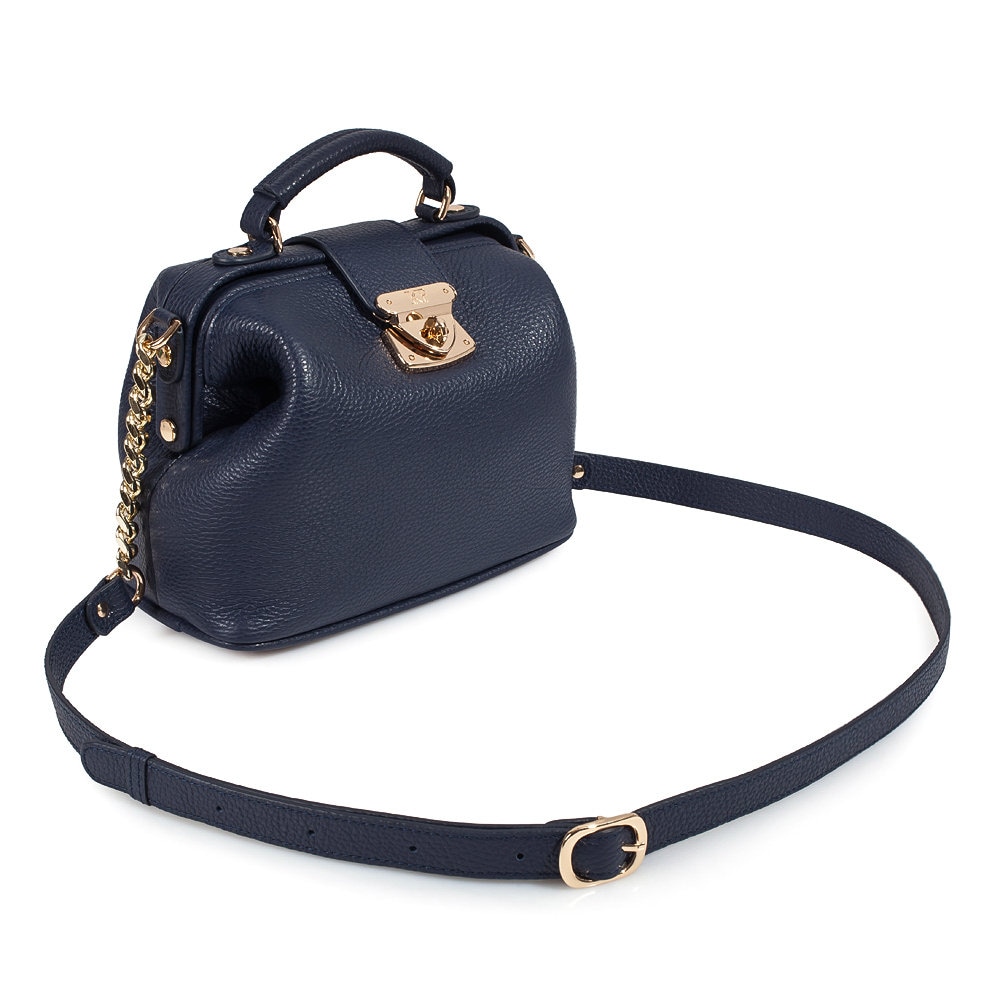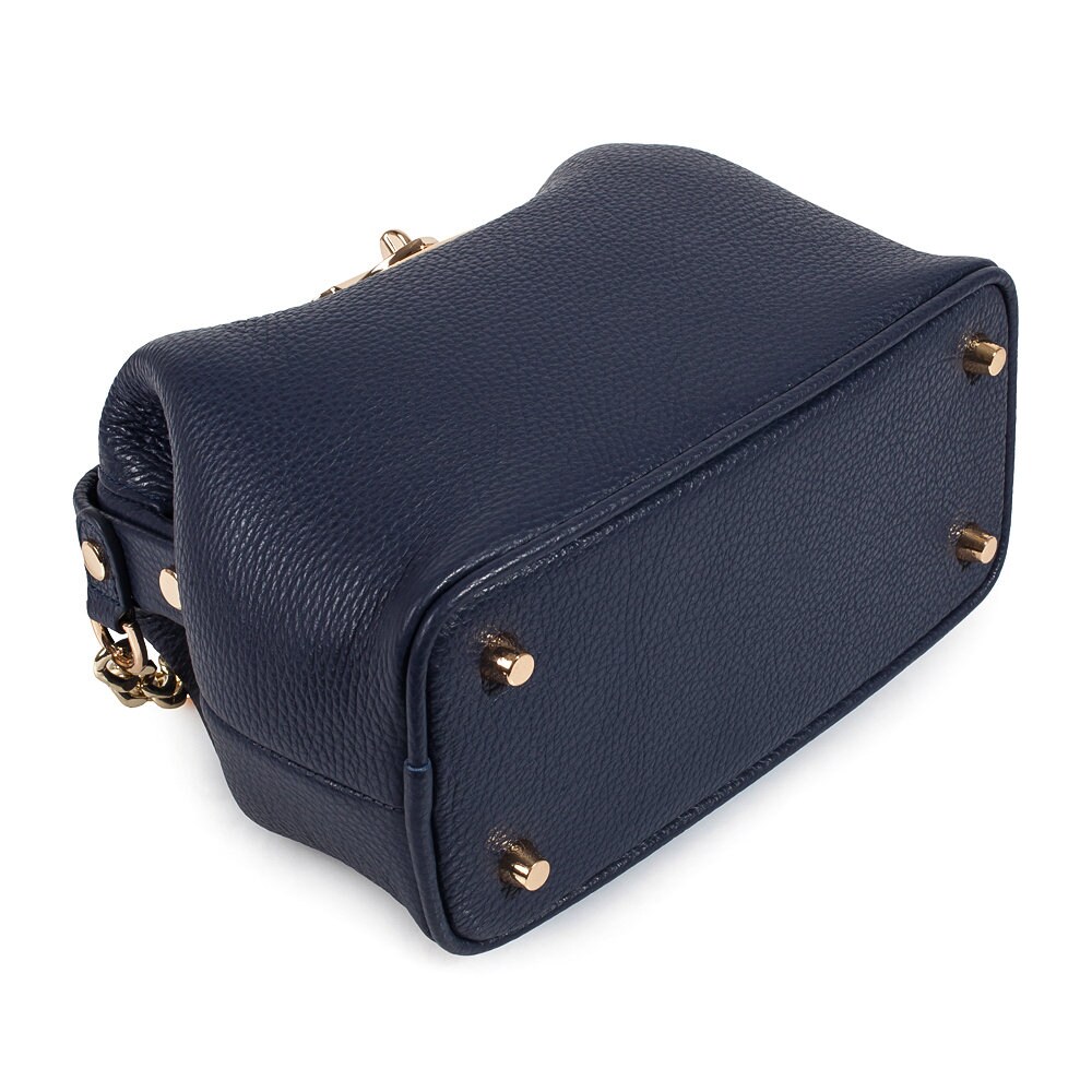 Navy blue genuine leather handbag from ukrainian designer Katerina Fox. This model is designed for women who appreciate the sleek design combined with functionality and comfort. High-quality and reliable hardware ensure long service bags. The internal space of a bag is equipped with one spacious compartment and two patch-pockets and one zipper pocket. The bag is closed with a clasp. The bottom of the bag is protected with metal legs. There is a long handle that allows you to wear the bag on the shoulder. The kit also includes a storage bag.